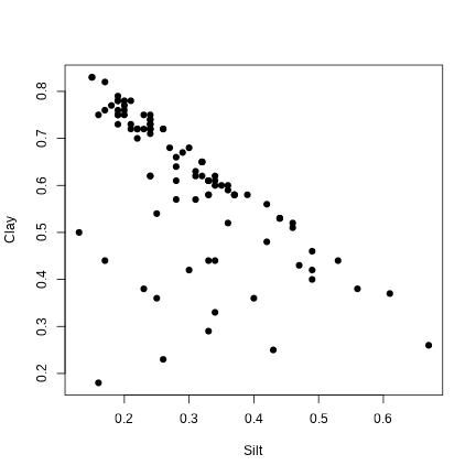 plot(Clay ~ Silt, data = envir.vars, pch = 19)