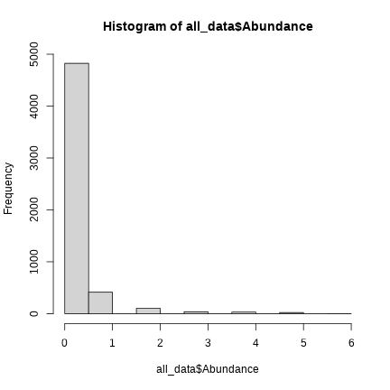 ## Min. 1st Qu. Median Mean 3rd Qu. Max. ## 0.0000 0.0000 0.0000 0.1788 0.0000 6.0000# how many zeroessum(all_data$Abundance == 0)