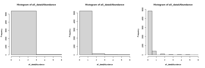 par(mfrow = c(1,3))hist(all_data$Abundance, breaks = seq(0, max(all_data$Abundance), length = 3))hist(all_data$Abundance, breaks = seq(0, max(all_data$Abundance), length = 5))hist(all_data$Abundance)
