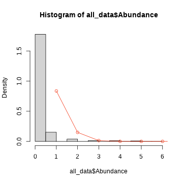 # maximum of abundanceab.max <- max(all_data$Abundance)# lambdaab.med <- mean(all_data$Abundance)hist(all_data$Abundance, probability = TRUE)points(dpois(0:ab.max, ab.med), col = cor[5])lines(dpois(0:ab.max, ab.med), col = cor[5])